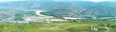 藍(lán)天白云之下,廣闊的平地上,綠意盈盈,農(nóng)人在田間忙碌,鋤田薅草,扶苗施肥,裊裊炊風(fēng)里飄蕩出生活的恬靜與安逸。我放飛無人機(jī),俯瞰鐵城堡故址全貌、周邊的田地和村莊以及靜靜流淌的洮河。