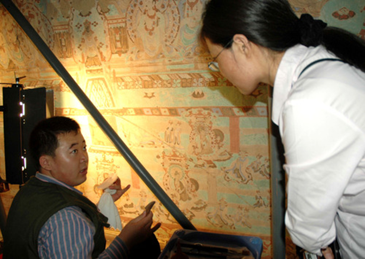 為了讓游客了解世界文化遺產(chǎn)敦煌莫高窟的壁畫保存現(xiàn)狀、保護原則、保護方式,提高公眾對莫高窟文物的保護意識,2008年6月以來,敦煌莫高窟壁畫保護修復(fù)現(xiàn)場每周定期向游客開放。圖為2008年9月22日,在莫高窟98窟內(nèi),敦煌研究院保護人員(左)正在向一名游客講解如何修復(fù)壁畫。新華社記者王艷明攝