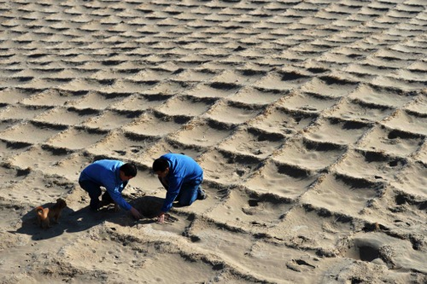 記者從敦煌研究院了解到,到2014年,經(jīng)過70年持續(xù)風(fēng)沙治理,風(fēng)沙對敦煌莫高窟的危害顯著降低,進入窟區(qū)年積沙量減少85%以上。據(jù)敦煌研究院保護所副所長汪萬福介紹,在幾代治沙人的努力下,莫高窟頂已形成由防沙障阻沙、沙生植物林帶擋沙、麥草方格沙障固沙和礫石壓沙組成的風(fēng)沙防治綜合體系,極大減緩了風(fēng)沙對敦煌壁畫和塑像等文物的危害,改善了窟區(qū)生態(tài)環(huán)境。圖為2014年8月29日,兩名工作人員檢查用于固沙的麥草方格。新華社記者陳斌攝
