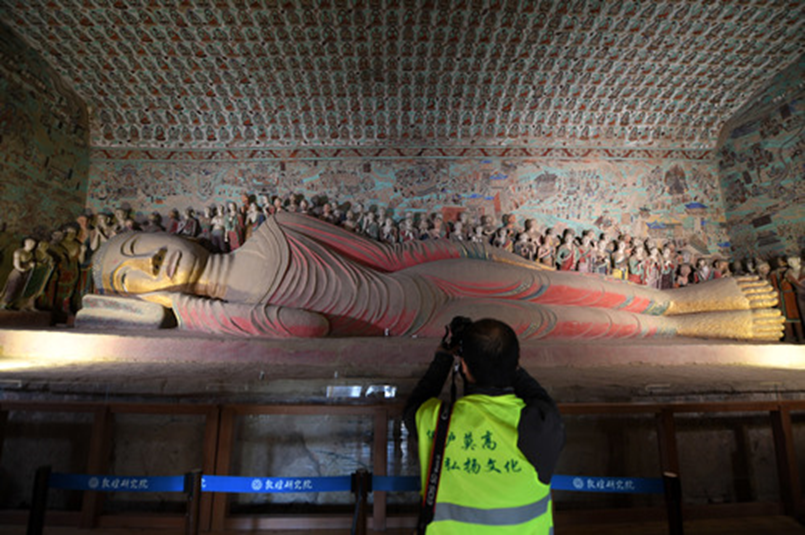 2016年10月11日,百名攝影師分組分批走進甘肅敦煌莫高窟洞窟內(nèi)部進行攝影創(chuàng)作,領(lǐng)略莫高窟神韻。圖為當(dāng)日,攝影師在敦煌莫高窟第148窟拍攝臥佛。新華社記者范培珅攝