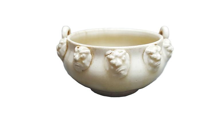 胎白質(zhì)細(xì),內(nèi)外垂?jié){淚痕處閃青,足底無釉,采用模印和堆貼技法。大口短頸,鼓腹內(nèi)收,口外附二個(gè)對(duì)稱的環(huán)形耳,耳根部飾三個(gè)鉚釘形圓餅,兩耳間各貼五個(gè)怒目圓睜的頭面像。