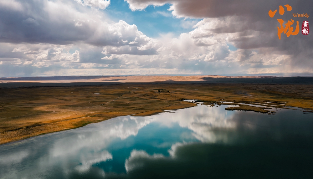 放眼望去,高低不平的草灘上嵌著一洼巨大的清亮的湖水,水面平靜,水清見底,像明鏡一樣的湖水映出了藍(lán)天白云的倒影。