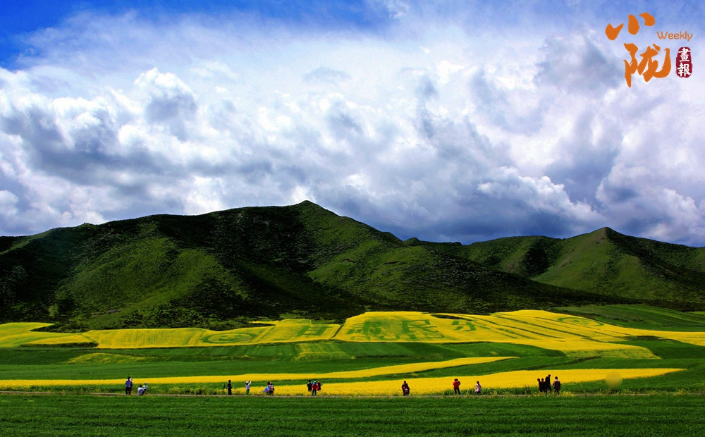遠(yuǎn)處,山巒高低起伏;近處,黃綠相間。金黃的油菜花和藍(lán)天、雪山、白云融合在一起,組成了別致的夏日美景,充滿了西部特有的浪漫色彩。