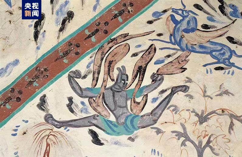 賽跑:圖中羽人奮力奔跑,腿呈一字形跨跳,騰空而起,雙手握飄帶,表現出凌空飛躍情景。莫高窟第249窟,西魏。