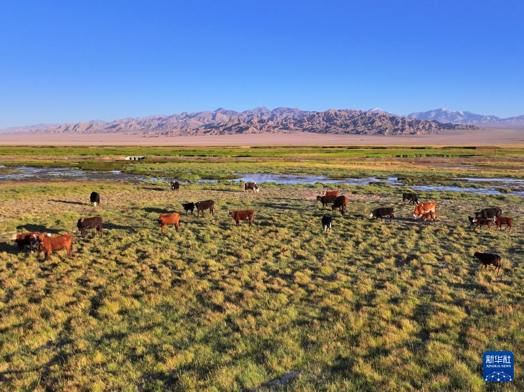 7月30日,牛群在大蘇干湖濕地覓食(無(wú)人機(jī)照片)。新華社發(fā)(高宏善 攝)