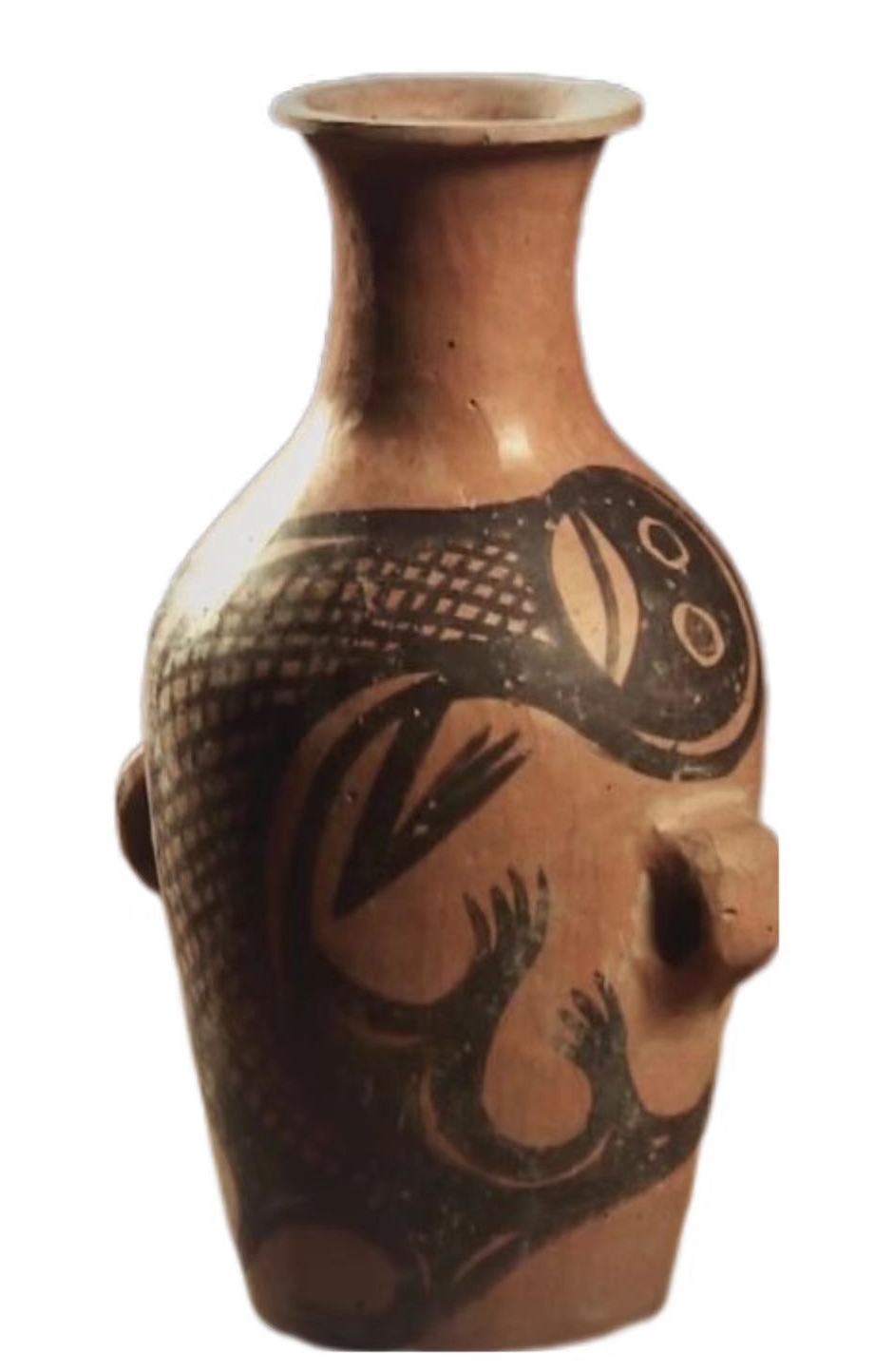 這件鯢魚紋彩陶瓶為泥質(zhì)紅陶,高18.5厘米,口徑寬5.7厘米,底徑7厘米,腹徑14厘米,重430克。陶瓶最顯著的特征是在腹部繪有動物圖紋。動物的身子呈蜷曲狀,尾巴向上翹舉,交于頭上。臉?biāo)迫嗣妫p眼圓睜而有神。嘴巴寬闊,顎下有須,頭頂兩側(cè)有伸出的節(jié)肢狀腮。奇怪的是,它只有一對前肢,肢端有張開的四肢。陶瓶身上繪制有網(wǎng)格狀的線紋。線條流利而生動,變化豐富,展現(xiàn)出了熟練自如的繪畫技巧。從鯢魚圖案的繪制來看,紋飾用筆鋒畫作的線條遒勁有力,頓挫有致。粗細(xì)不同的線條之間,還凸顯出了圖紋部位的主次。彩陶的出現(xiàn),也似乎在見證著先祖?zhèn)冊谑庝离x居、不常厥邑的歲月中所經(jīng)歷的那些艱難生活。