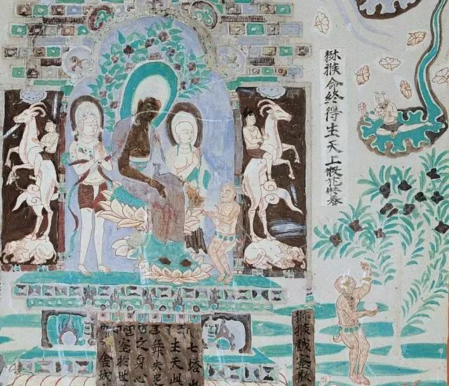 壁畫畫面右側有一飛天正在散花,云端之下是一棵茂盛的大樹,一只猴子正仰著頭,一手舉起做采摘狀。其旁側有白底墨書題記寫著“獼猴命終得生天上散花供養(yǎng)”。畫面右側一佛坐蓮花座之上,兩旁一弟子一菩薩協侍左右,一只猴子雙手捧一缽,虔誠地供養(yǎng)佛。