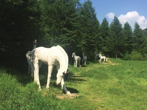 在碧草連天的谷地,當地旅游部門擺放了一組白馬的大型雕塑,栩栩如生,它們要么仰天長嘶,要么低首撫弄地上的青草,還有的彼此耳鬢廝磨,像是親密的戀人。
