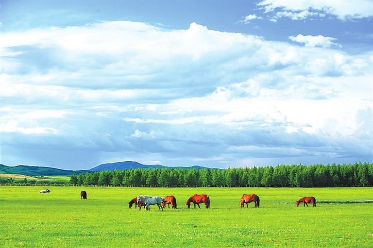 置身草原,高遠(yuǎn)空曠的天空下面,是明凈遼闊的草場,白色的羊和黑色的牛像灑落在草叢中的白珍珠和黑珍珠,一頂頂帳篷點(diǎn)綴其間,不遠(yuǎn)處,有游人騎在馬背上,優(yōu)哉游哉,或拍照或奔馳。這里一年四季景色都十分迷人:春天山花爛漫,姹紫嫣紅,如煙如夢;夏季綠草如茵,碧波浪涌,養(yǎng)心養(yǎng)眼;秋天云纏霧繞,層林盡染,美麗迷人;冬天銀裝素裹,瓊花玉樹,一派北國風(fēng)光。