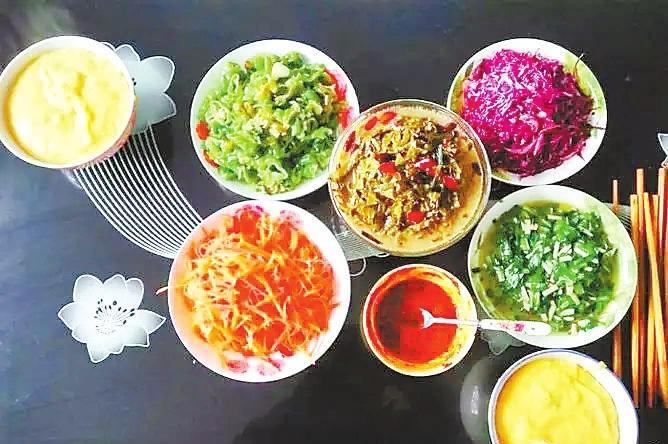 百人百心病,百人百口味?,F(xiàn)在的人吃馓飯,對(duì)菜品的要求越來(lái)越高了,除了酸菜,人們大多還會(huì)調(diào)一些涼菜,或炒一些菜,蘿卜的,肉丁的,山野菜的,虎皮辣子的,滿滿地?cái)[上一桌子,如錦上添花,令人食欲大增。