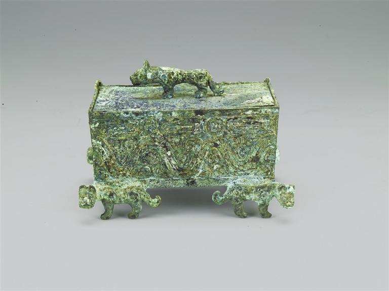 1993年山西省曲沃縣北趙村晉侯墓地62號墓出土。波曲紋虎足方盒為生活用具,出土于晉穆侯夫人墓。盒為長方形,口徑略大于底徑,斜直壁,頂部有立體的虎形捉手,兩扇小蓋可以開啟,盒下有四虎為四足,虎首朝外。盒四壁上部飾鱗紋,下部飾波曲紋。此盒設(shè)計精巧,器型較小,紋飾精美,應(yīng)是古代貴族女性用來珍藏小型物件的容器。