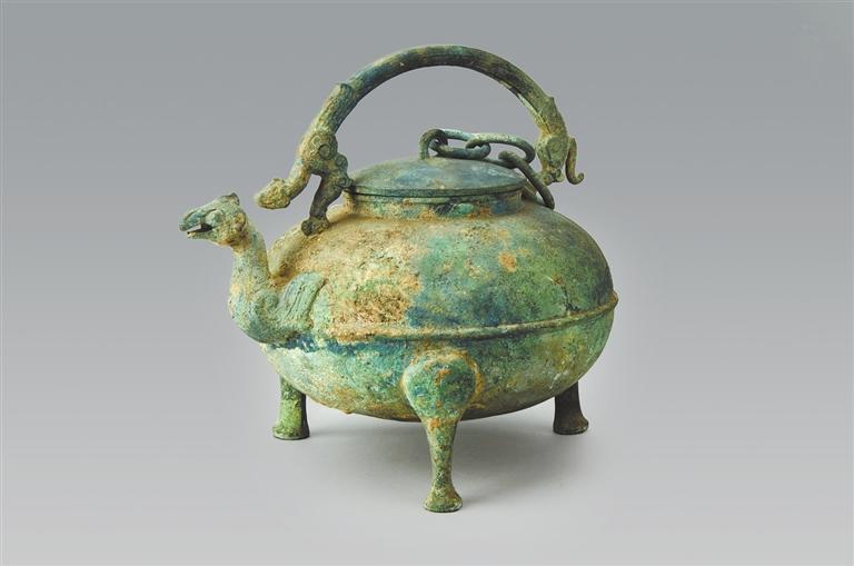 山西省侯馬市上馬村14號墓出土。器為直口窄平沿,口沿前部有虎頭形管狀流,雙附耳,腹部圓收形成圜底,下承三獸蹄足。捉手的虎頭向左前方斜視,虎尾下垂后向上卷曲,流口虎嘴大張,雙目凝視,雙耳直立,器口沿下飾獸目交連紋,腹部飾重鱗紋。