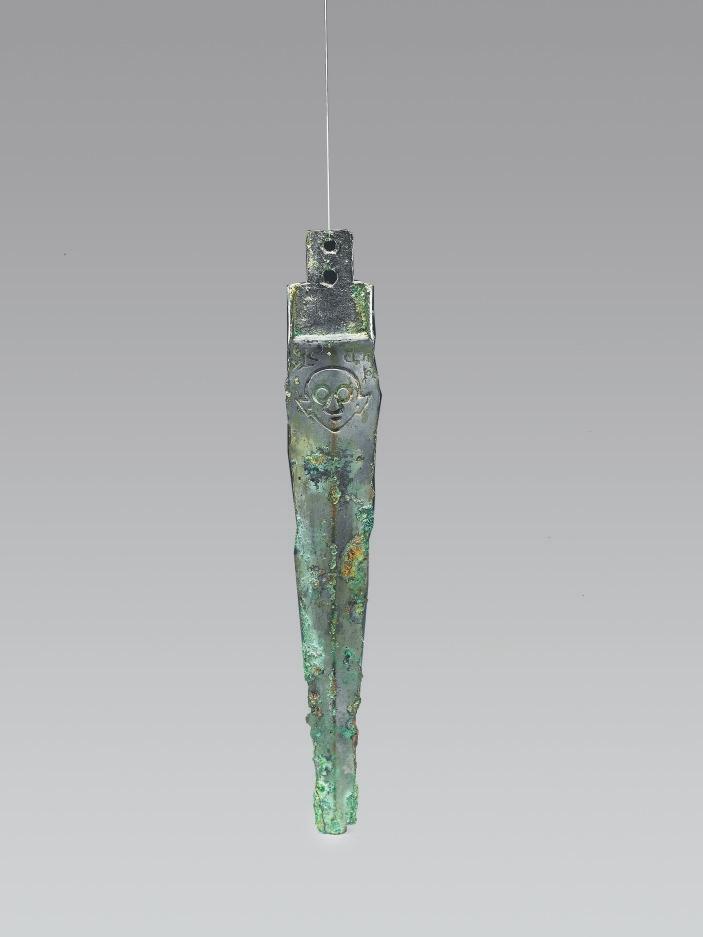 山西省絳縣橫水墓地出土。身呈長條形,中部起脊,兩刃斜直,刃緣鋒利,劍身橫截面呈菱形。莖格部平面呈“凸”字形,有闌,側(cè)闌凸起,橫截面呈“工”字形,后端較窄,有兩個圓穿。劍身近莖格處兩面均飾陰線人面紋。雙合范鑄造。兩面人面紋頭頂上方鑄銘文:“楚公逆□□中戈。”考古人員推斷,有可能該件器物的作器者為楚公逆,與晉侯墓地M64出土的楚公逆編鐘、宋代嘉魚縣出土的楚公逆鐘的作器者為同一人。