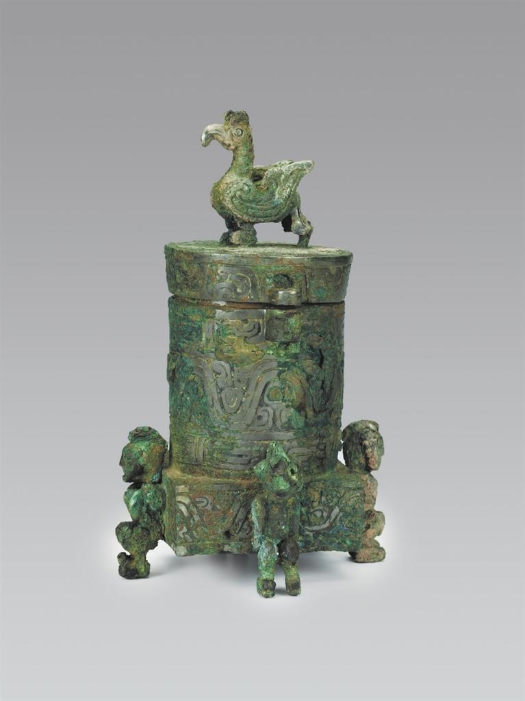 山西省曲沃縣北趙村晉侯墓地63號墓出土。圓筒形,帶蓋,蓋與器體以子母口套合,蓋平頂,上有圓雕立鳥形鈕,鳥彎喙,雙目圓睜,作展翅欲飛狀。器為平口,口沿有一對貫耳,直壁,方形底座,底座四壁各有一個人形足以承器體。人發(fā)髻高聳,赤身裸體,屈膝下蹲,作奮力抬舉器物狀,形象寫實生動。方座飾波曲紋,內(nèi)底有兩只小鈴,可發(fā)聲。蓋頂飾斜角云紋一周。蓋沿和口沿飾變形獸體紋,筒腹和方座飾波曲紋,筒下層飾鱗紋一周。這種形制的青銅器尚屬首見,其功用還有待于深入研究,但它獨特的藝術(shù)造型和裝飾卻可以說是集眾器之長,獨步天下。