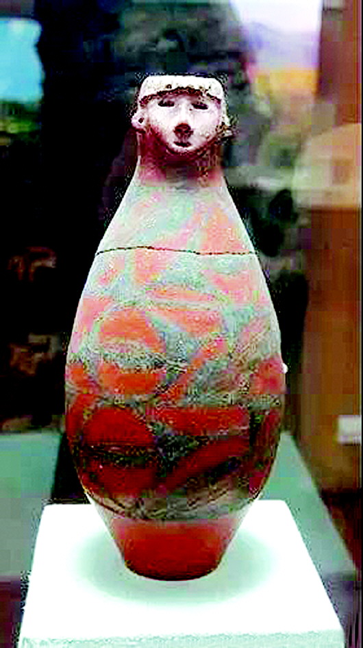 這件距今約6000年的文物,高31.8厘米,口徑4.5厘米,底徑6.8厘米,被許多人稱之為半神半人彩陶瓶。瓶為細(xì)泥紅陶質(zhì)地,腹部以上施陶衣。器型為兩頭尖的圓柱體,下腹內(nèi)收。瓶器口為圓雕人頭像,披發(fā),堪稱遠(yuǎn)古時(shí)期的雕塑杰作。