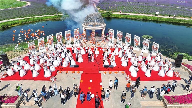 陽光、微風(fēng)、花海……夏季的金昌紫金花海充滿浪漫氣息,溫柔而熱烈。6月29日上午,連續(xù)舉辦七屆的“遇見愛,遇見你”薰衣草集體婚禮如約開場。近年來,一場場薰衣草之約集體婚禮引領(lǐng)金昌婚慶經(jīng)濟(jì)進(jìn)入一個(gè)快速發(fā)展階段,集體婚禮也成為金昌旅游對外宣傳推介的一張亮麗名片。