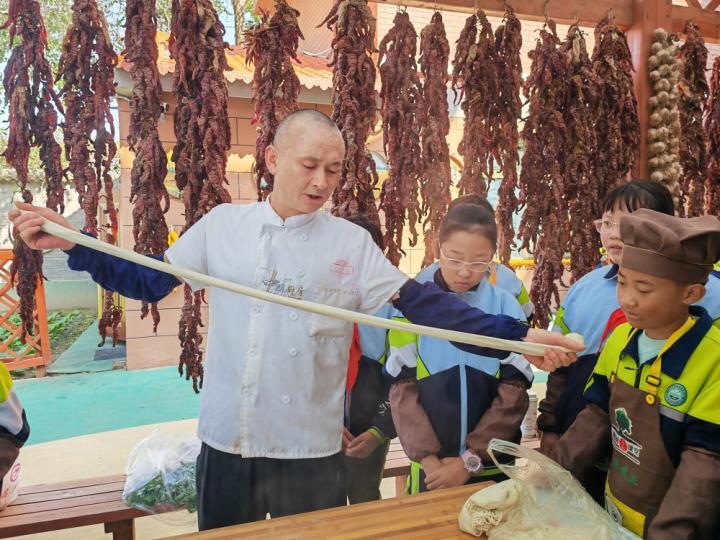 話音剛落,同學(xué)們戴上廚師帽,系好圍裙,紛紛擼起袖子嘗試制作蘭州牛肉面,他們學(xué)著老師的模樣搓制面團、拉面條,切蒜苗……從中學(xué)習(xí)制作這一傳統(tǒng)美食的技藝。