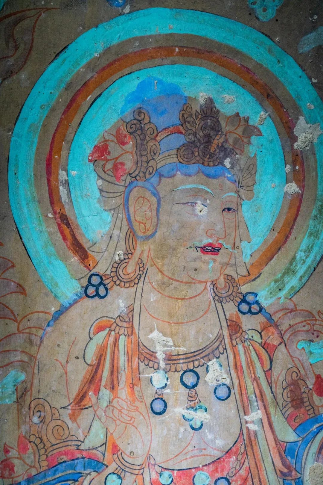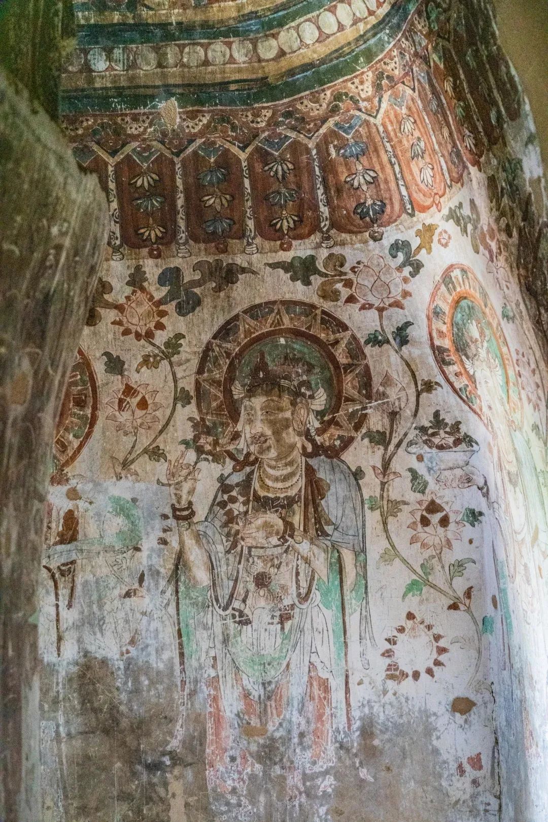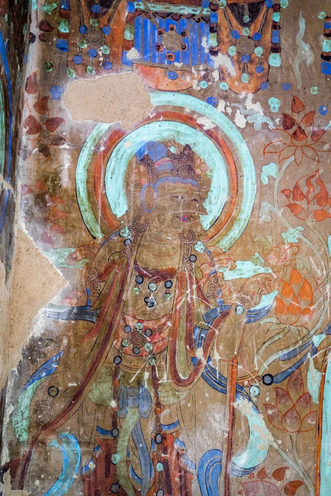 現(xiàn)在第4窟中早期塑像多數(shù)已毀,但仍殘存少數(shù)幾身,十分珍貴;各側(cè)面表層為西夏重修時(shí)繪制的壁畫;柱座與柱身的兩層自下而上逐層縮小;中心柱正面在西夏時(shí)改造成一橢圓形的大背屏,背屏正面表層為清代重繪的壁畫;四壁及頂上壁畫也多為西夏時(shí)期。