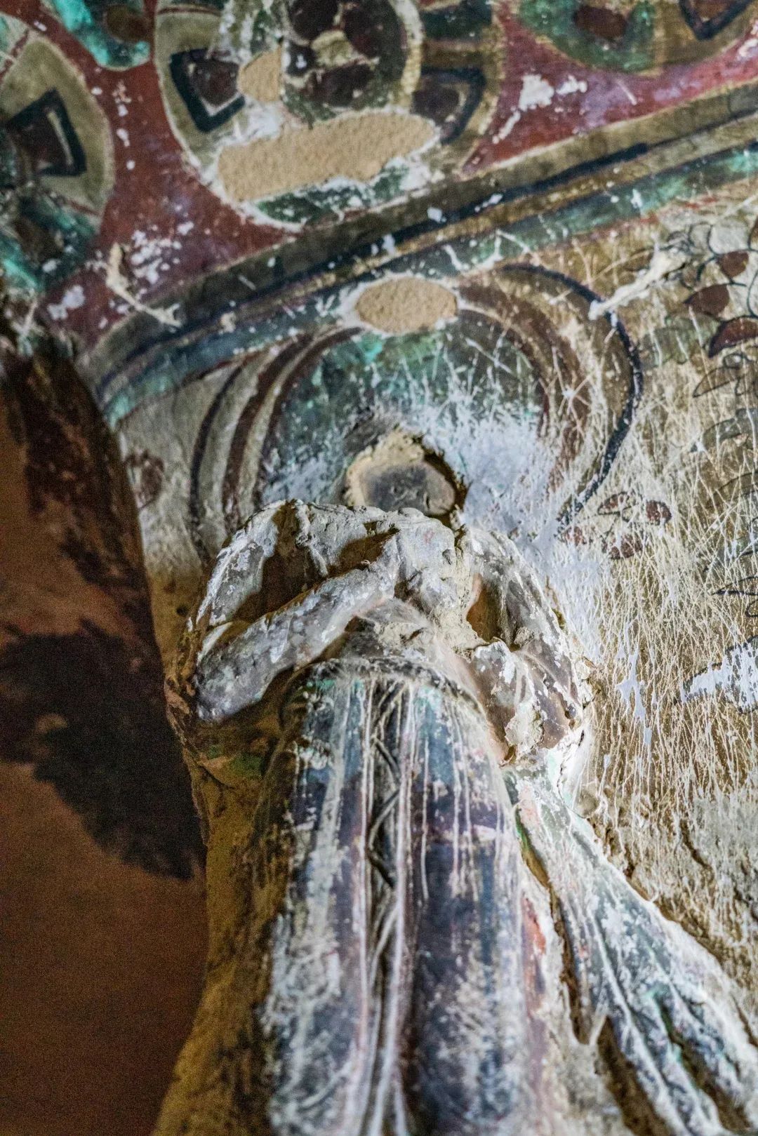 塑像題材為簡(jiǎn)單的一佛二菩薩。內(nèi)塑一坐佛像,龕外兩側(cè)各塑一脅侍菩薩像,上層開(kāi)—淺龕,中間塑一結(jié)跏趺坐佛像,面相渾圓,雙手?jǐn)n于袈裟內(nèi),衣角垂于腹前,陰線刻衣紋。頭部均毀,露出麥草扎成的骨干。龕外兩側(cè)各塑一脅侍菩薩像,雙手合十,佩項(xiàng)圈、瓔珞,披帛搭于肩上,帛帶下垂外張。佛與菩薩,作風(fēng)古樸,技法概括而又簡(jiǎn)練,很接近敦煌莫高窟259窟,其時(shí)代可能為北涼時(shí)期。