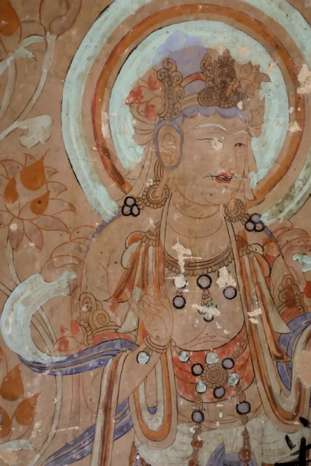 昌馬石窟第1、2、4窟表層西夏時(shí)期所繪壁畫的內(nèi)容,用色及菩薩的服裝等極接近敦煌莫高窟第328、327窟和榆林窟第17窟西夏壁畫。其用筆比較端莊拘謹(jǐn),不似唐代自由流暢;用色以赭紅、大綠為主;人物造像尤其是菩薩形象程式化,菩薩衣飾華麗復(fù)雜,但神態(tài)略顯呆板,不似唐代優(yōu)美生動(dòng)和神采煥發(fā);裝飾圖案繁縟化,這些都與敦煌莫高窟、瓜州榆林窟、肅北五個(gè)廟同時(shí)期的壁畫具有統(tǒng)一的時(shí)代風(fēng)格。