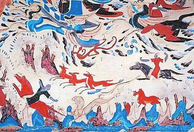 在莫高窟第249窟壁畫(huà)中有一幅“行獵圖”:畫(huà)面上都是些體型巨大的動(dòng)物,有體態(tài)矯健的猛虎、疾馳俊逸的鹿群、整裝待發(fā)的獅子等,有在奔馳的駿馬上拈弓搭箭窮追不舍的獵人,還有在飛奔的駿馬上淡定轉(zhuǎn)身從容射虎的獵人。整個(gè)畫(huà)面既緊張又美好,使人不由得對(duì)畫(huà)師精湛的技藝心悅誠(chéng)服。唐代詩(shī)人王維在詩(shī)作《觀獵》中寫(xiě)道:“風(fēng)勁角弓鳴,將軍獵渭城。草枯鷹眼疾,雪盡馬蹄輕。忽過(guò)新豐市,還歸細(xì)柳營(yíng)?;乜瓷涞裉?,千里暮云平。”意思是說(shuō)將軍的獵騎,飛馳在渭城的近郊。風(fēng)中傳來(lái)呼嘯的弦聲。已枯的野草,擋不住尖銳敏捷的鷹眼,積雪后飛馳的駿馬馬蹄會(huì)愈加輕盈。據(jù)文獻(xiàn)記載,唐宋時(shí)期人們打獵時(shí)多有一種“西北望,射天狼”的豪情!在莫高窟第85窟壁畫(huà)中還有一幅“行獵圖”就形象地反映了唐人狩獵的情景:畫(huà)面上的四個(gè)健碩獵人正在整裝出獵,他們著裝統(tǒng)一:頭戴幞頭,身穿缺胯衫,足蹬半腰靴。打獵的裝備也很不同:有人胳臂上架鷹、有人單手牽犬、有人持弓挎箭囊,甚至還有一人手持利斧。