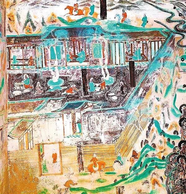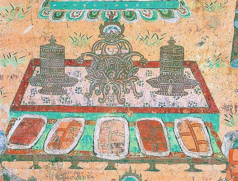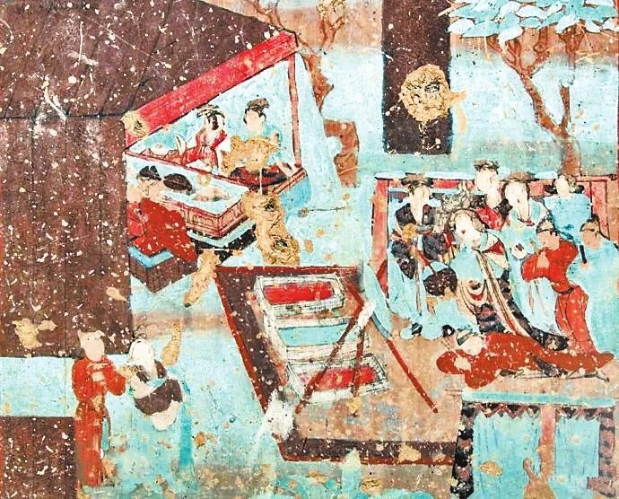 古人會(huì)在一年的歲末舉行一次集體聚會(huì),稱作“建福”。在敦煌文獻(xiàn)《社司轉(zhuǎn)帖》中寫(xiě)道:“右緣常年建福一日,人各爐餅壹雙,凈粟壹斗。幸請(qǐng)諸公等,帖至限今月廿二日卯時(shí)于安家酒店取齊。”意思是說(shuō),只要有可能,每年到了年末大家都要選擇一日來(lái)進(jìn)行建福。每家每戶需要按時(shí)把準(zhǔn)備建福的物資送過(guò)來(lái)。唐朝詩(shī)人李白在《客中行》一詩(shī)中寫(xiě)道:“蘭陵美酒郁金香,玉碗盛來(lái)琥珀光。但使主人能醉客,不知何處是他鄉(xiāng)。”意思是說(shuō)蘭陵美酒甘醇甜美,就像郁金香一樣芬芳四溢。興來(lái)盛滿玉碗,泛出琥珀光晶瑩迷人。主人端出如此好酒,定能醉倒他鄉(xiāng)之客。飲酒之后哪能分清故鄉(xiāng)與他鄉(xiāng)呢?歲暮聚飲蘊(yùn)含有辭舊迎新、攘兇納吉的美好愿望。在莫高窟第12窟壁畫(huà)中有一幅“帳篷酒肆圖”:畫(huà)面中圍坐在條形長(zhǎng)桌兩邊正盡興暢飲的客人為七人,還有兩個(gè)熱情忙碌的服務(wù)人員。整個(gè)畫(huà)面是一幅酒酣耳熱、興致高昂的歡飲圖。更為氣勢(shì)恢宏、熱鬧非凡的是莫高窟第23窟壁畫(huà)中一幅“院落圖”:畫(huà)面中分院落之內(nèi)與院落之外兩個(gè)部分,院落之內(nèi)是世俗的世界,畫(huà)面上布局著鱗次櫛比的廳堂房屋,有人正在庖廚、有人正在對(duì)弈、有人正在暢聊、有人正在團(tuán)聚,也有人正在說(shuō)教,總之表現(xiàn)的是我們?nèi)粘I畹陌賾B(tài)。院落之外是佛國(guó)世界,整體呈現(xiàn)出肅穆莊嚴(yán)之感。有趣的是在佛國(guó)與世俗世界中間,畫(huà)的是服飾艷麗,騎馬遠(yuǎn)行的人們。