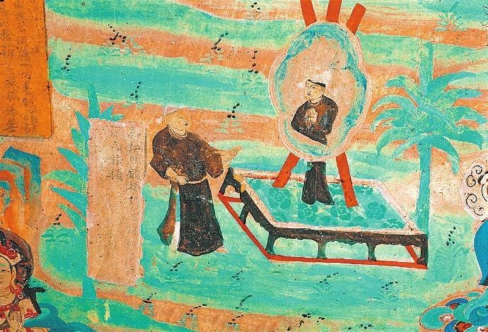 戰(zhàn)國(guó)時(shí)期楚國(guó)詩(shī)人屈原在《漁父》一文中寫(xiě)道:“吾聞之,新沐者必彈冠,新浴者必振衣。安能以身之察察,受物之汶汶者乎?”意思是說(shuō)我聽(tīng)說(shuō)剛洗過(guò)頭的人一定會(huì)去彈彈帽子上的灰塵;剛洗過(guò)澡的人一定要抖抖衣服的灰塵。怎能讓清白的身體去接觸世俗塵埃的污染呢?當(dāng)年的敦煌人走出溫泉,在身心放松之后,就該靜觀返照自己了。在莫高窟第85窟中有一幅“曲花式鏡圖”:畫(huà)面上在一個(gè)正方形鏤空的底座上擺放著一個(gè)巨大的曲花式鏡,鏡子式樣別致,明亮澄澈。藍(lán)色的曲花式樣引人矚目。但畫(huà)面上最吸睛的是一位魁梧俊朗身著一襲赭色長(zhǎng)袍的男子,他正在鏡子前仔細(xì)地打量自己,而鏡中映射出他神情凝重的情態(tài)來(lái)。原來(lái),古人照鏡除了正衣冠之外,還有反觀自照的含義,在鏡子前良久地注視自己,就是對(duì)自己反省、頓悟的過(guò)程。“一年好景君須記”,走過(guò)四季,到了歲末,該是每個(gè)人回望來(lái)時(shí)路,展望前方的時(shí)候了。