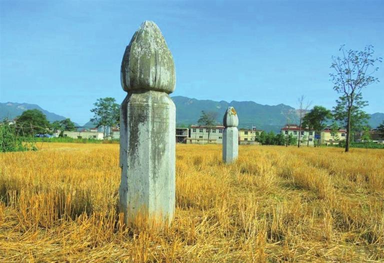 平闊的川地,村人已把一地莊稼收入自己殷實的谷倉,田野涂遍了陽光的顏色。遠(yuǎn)遠(yuǎn)地,我們就看見一座有兩尊八楞蓮苞頭華表矗立在田野之間,在另一塊地里,還有一個僅裸露肩膀于地表、頭顱已缺失的石翁仲,圓領(lǐng)官服、胸垂綬帶的文官裝束隱約可見……