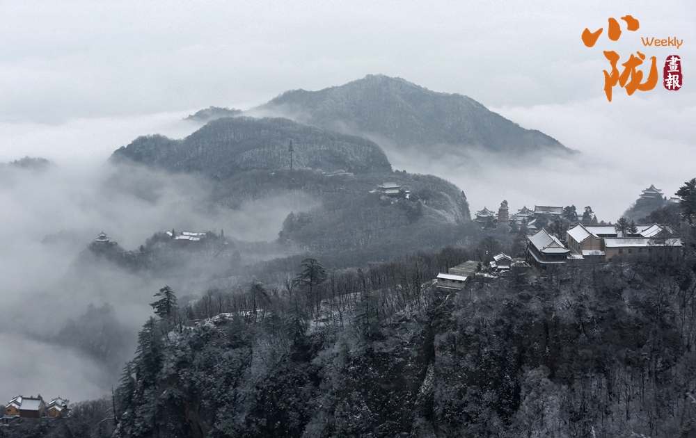 輕薄的雪花落在崆峒山巔,銀裝素裹下的樹木古剎和山下的湖泊美景分外迷人。
