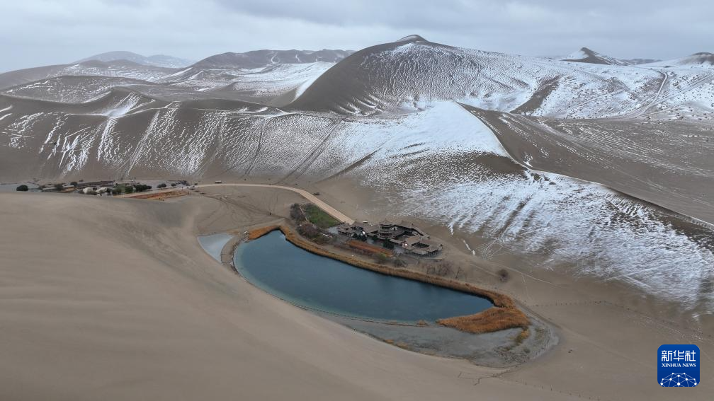 這是11月23日拍攝的敦煌市鳴沙山月牙泉景區(qū)雪景(無人機照片)。新華社發(fā)(張曉亮 攝)