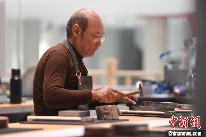 11月23日,甘肅省蘭州市楊樹(shù)珍剪紙工作室內(nèi),工匠名師劉金碌制作剪紙漢服作品的金屬帽邊。中新社記者 李亞龍 攝