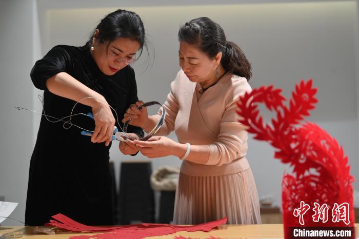 11月23日,甘肅省蘭州市楊樹(shù)珍剪紙工作室內(nèi),楊樹(shù)珍(右)帶領(lǐng)團(tuán)隊(duì)成員制作剪紙漢服。中新社記者 李亞龍 攝