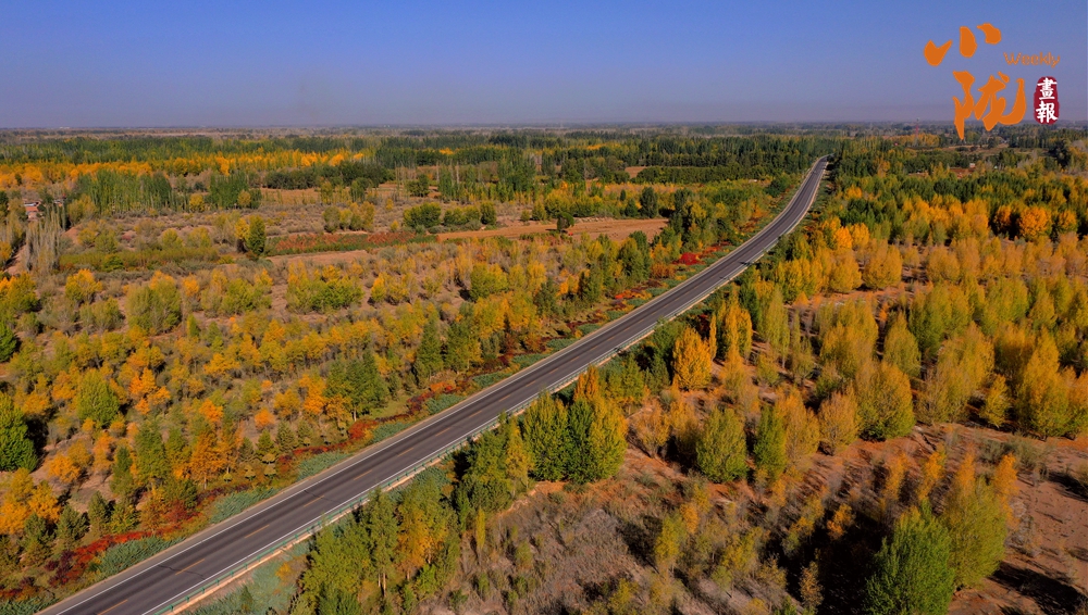 公路沿線成片的五彩林艷麗迷人,與藍(lán)天、荒漠共同勾勒出一幅色彩動(dòng)人的生態(tài)畫(huà)卷。