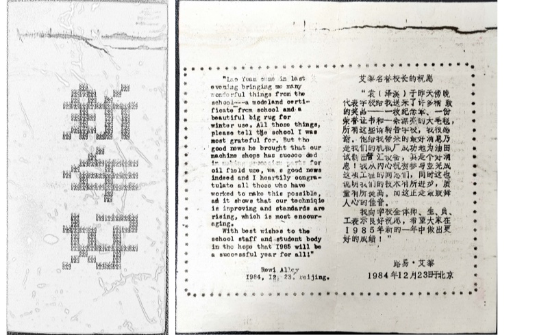 證書是由石油工業(yè)部培黎石油技校申報(bào)的。1984年12月30日,培黎石油技校自制的新年賀卡內(nèi)頁用中英文印上了名譽(yù)校長(zhǎng)艾黎的祝愿: