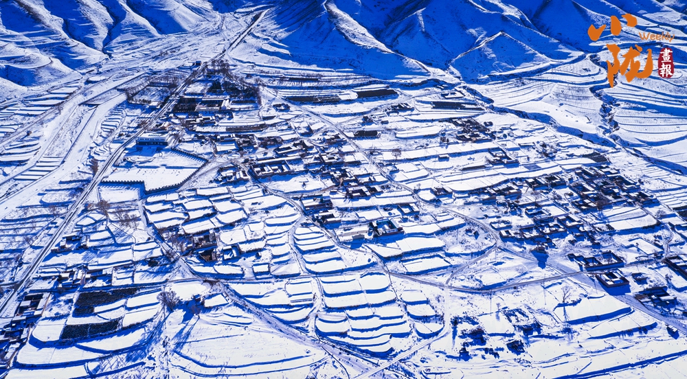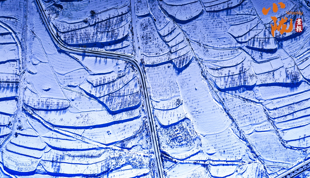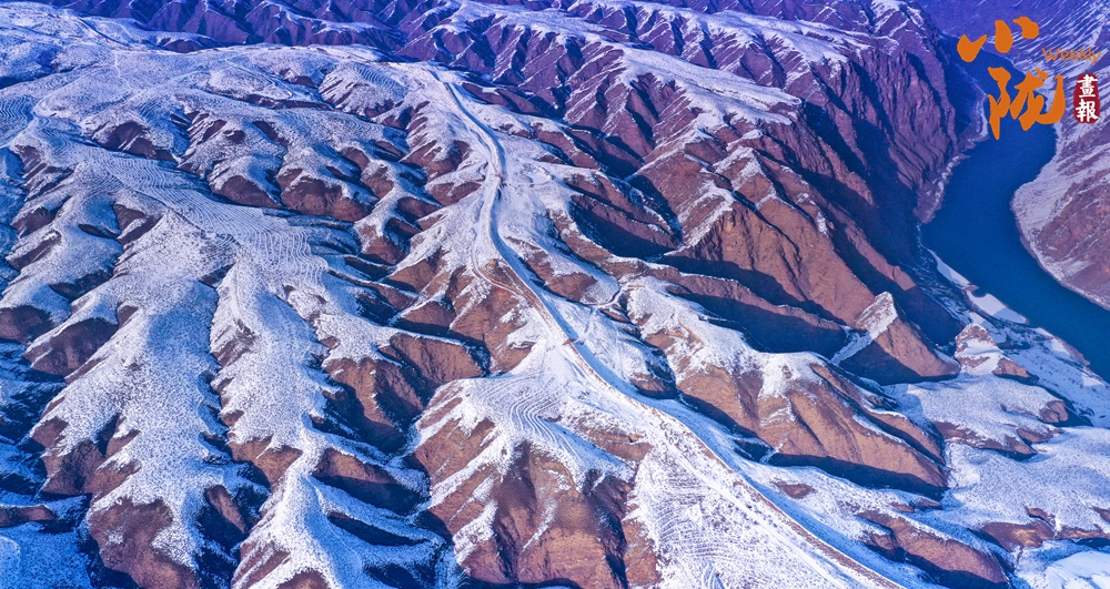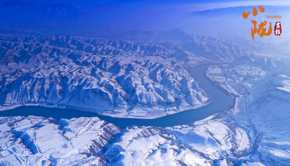 蜿蜒的黃河猶如一條藍絲帶飄舞在白雪覆蓋的山間、田野,兩岸被雪裝扮得格外壯麗,從空中俯瞰,宛若一幅水墨丹青畫。