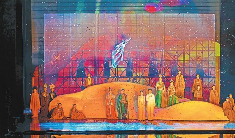 大型原創(chuàng)音樂劇《飛天》以“大愛”立意敘事,打破時空界限,利用現(xiàn)代舞美技術(shù),多維度、多角度、多層次地展現(xiàn)了敦煌石窟的無窮魅力,令觀眾身臨其境、沉浸其中,情感共鳴油然而生,獲得獨(dú)特的藝術(shù)體驗。(本文配圖均為《飛天》劇照,由蘭州大劇院提供)