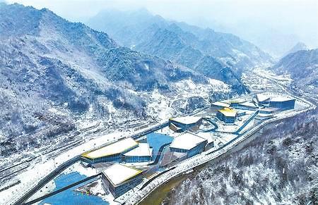 從縣城驅(qū)車不過(guò)半小時(shí)的車程,一路青松白雪,生機(jī)盎然。在游客中心,只見一大片水面倒映山川,文房四寶寫意排布,“四水歸堂”巧奪天工,龍軀接連兩岸山勢(shì),天地舒卷,日月提筆,步履為印,山水著墨,我們決定從這里開啟冬日青龍山之旅。