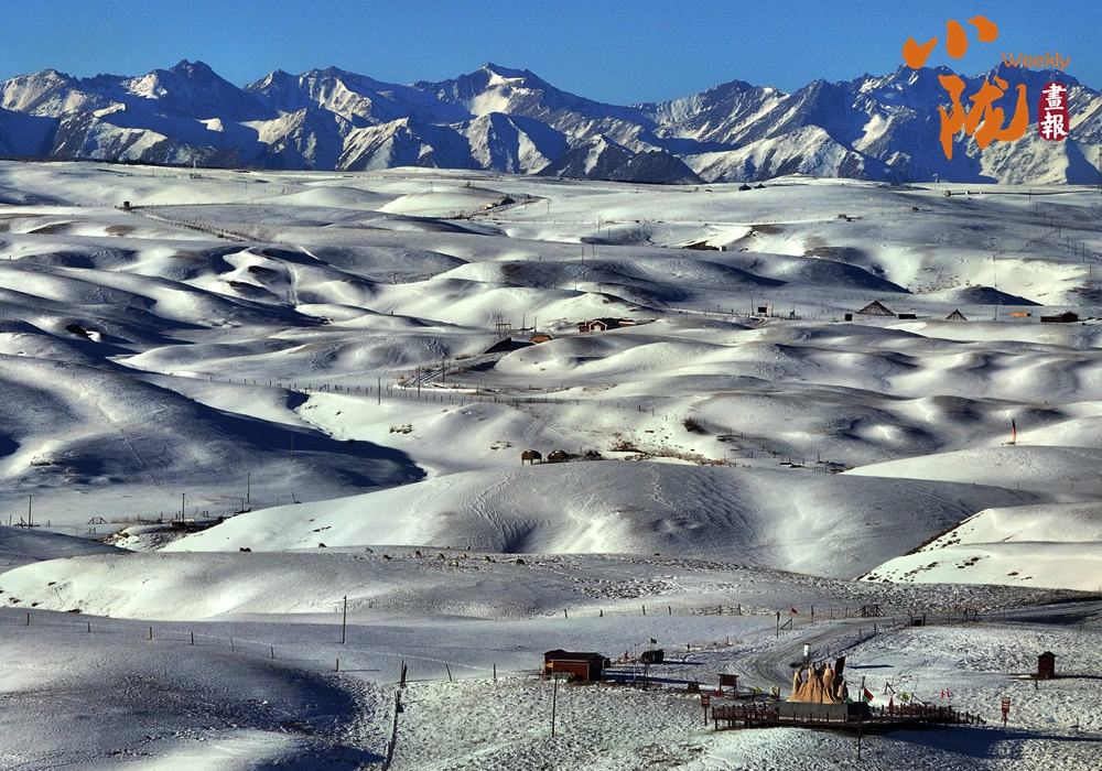藍天如洗,鋪滿白雪的草原,與群山相映,蒼茫無際,呈現(xiàn)出安然素美的意境。