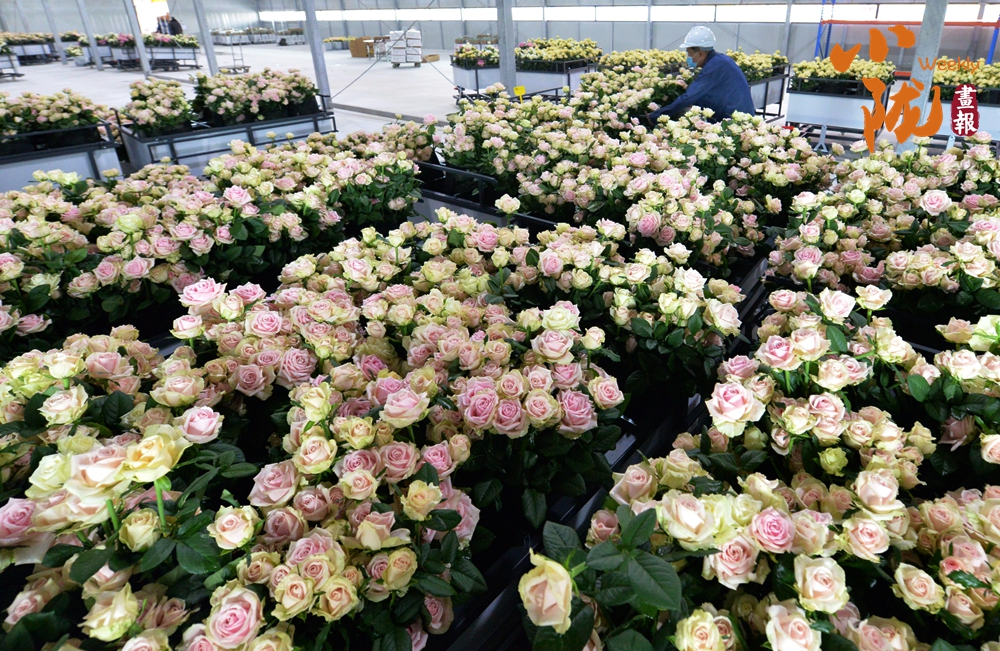工作人員忙著采摘、分揀、包裝,一束束鮮切玫瑰從這里搭乘冷鏈物流,不僅暢銷國(guó)內(nèi),還遠(yuǎn)銷海外,成為“一帶一路”上一張靚麗的名片。