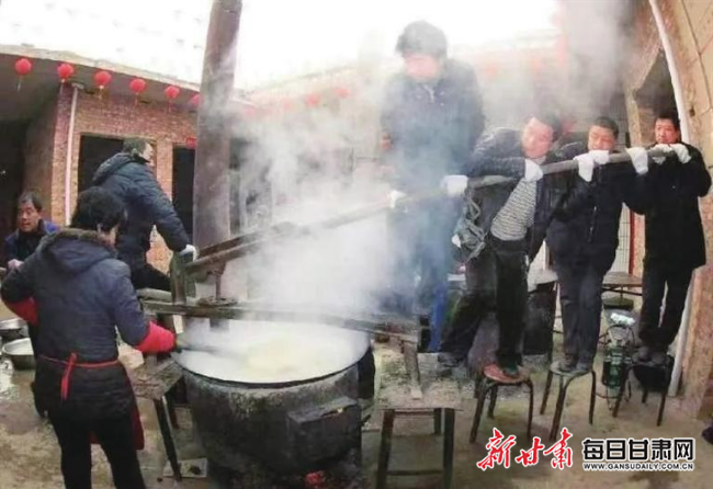在慶陽鄉(xiāng)村,一場紅白喜事的饸饹流水席往往能持續(xù)好幾天,數(shù)十張方桌一字?jǐn)[開,掌勺的主廚指揮著幫廚,以每分鐘出湯十幾碗的效率,完成著這場飲食行為藝術(shù)。