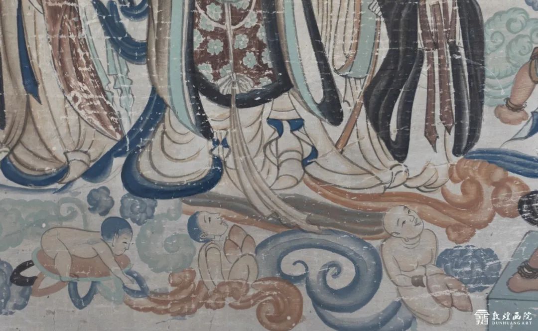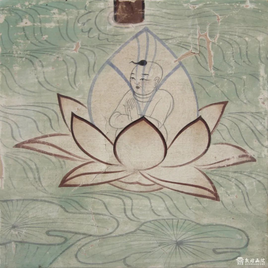 這幅臨摹于榆林窟25窟的化生童子雙手合十,外面蓮花瓣層層盛開,透過透明的花苞可以看到童子即將降生,生動可愛,和電影中的情節(jié)遙相呼應。
