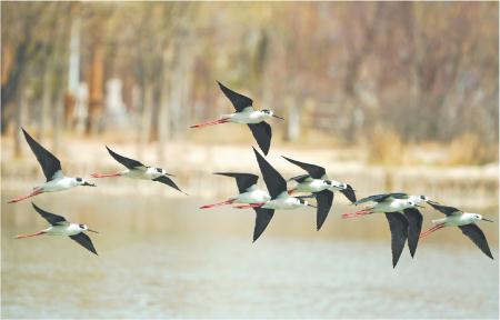 4月9日,一群黑翅長腳鷸在定西湖水面飛行。進入4月,候鳥陸續(xù)北遷,定西湖成了眾多鳥群遷徙途中的歇腳補給地。新定西·定西日報記者 牛小棟 攝