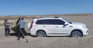車子終于在陷入沙地3小時(shí)后脫離困境??疾靾F(tuán)在羊井子鄉(xiāng)用過(guò)午餐后返回酒泉。