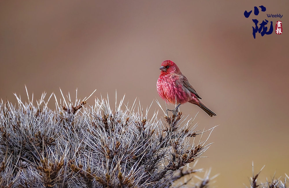 紅眉朱雀,是雀形目燕雀科朱雀屬的鳥類,中等體型,體長(zhǎng)約為15厘米。雄鳥的特征是眉紋和臉頰呈淡紫粉色,而上體則有褐色斑駁。雌鳥沒有粉色,難稱“漂亮”,它們?nèi)砘液稚?ldquo;朱”一點(diǎn)也不沾邊兒,實(shí)際上,很多鳥類的雌鳥都要比雄鳥暗淡很多,這種暗淡的顏色能幫助它們?cè)诜趼训臅r(shí)候更好地隱蔽,以逃過天敵的捕殺。雄鳥和雌鳥都類似于體型較小的曙紅朱雀。