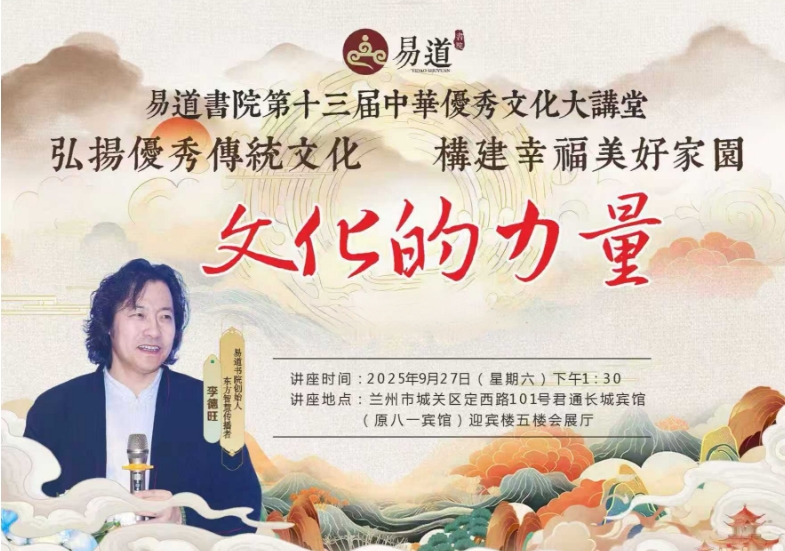 響應(yīng)時(shí)代號(hào)召,弘揚(yáng)傳統(tǒng)文化,旨在文化賦能行業(yè)發(fā)展,易道書(shū)院第十三屆中華優(yōu)秀文化大講堂將于9月27日在蘭州君通長(zhǎng)城賓館(原八一賓館)迎賓樓五樓會(huì)展廳開(kāi)講,誠(chéng)邀有志之士共襄盛舉,學(xué)習(xí)傳統(tǒng)文化,賦能行業(yè)文明,構(gòu)建美好家園!