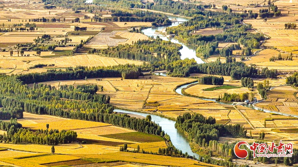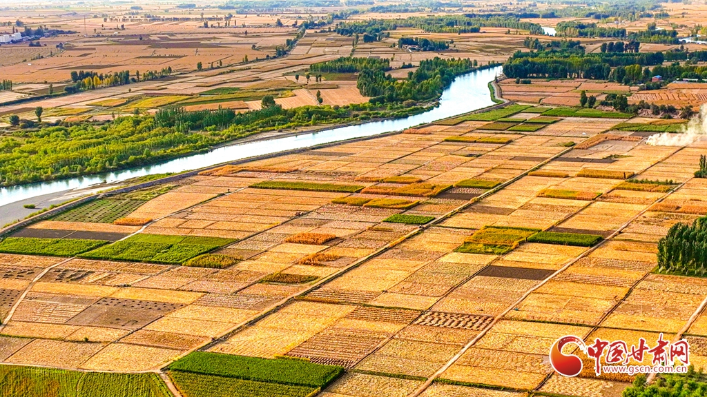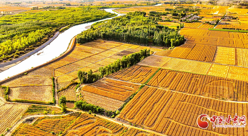 9月26日傍晚,夕陽映照下的黑河張掖臨澤縣鴨暖鎮(zhèn)段,蜿蜒流淌的河水與兩岸鋪滿金色的大地交相輝映,盡顯盎然生機,共同勾勒出一幅金秋豐收的壯美畫卷。