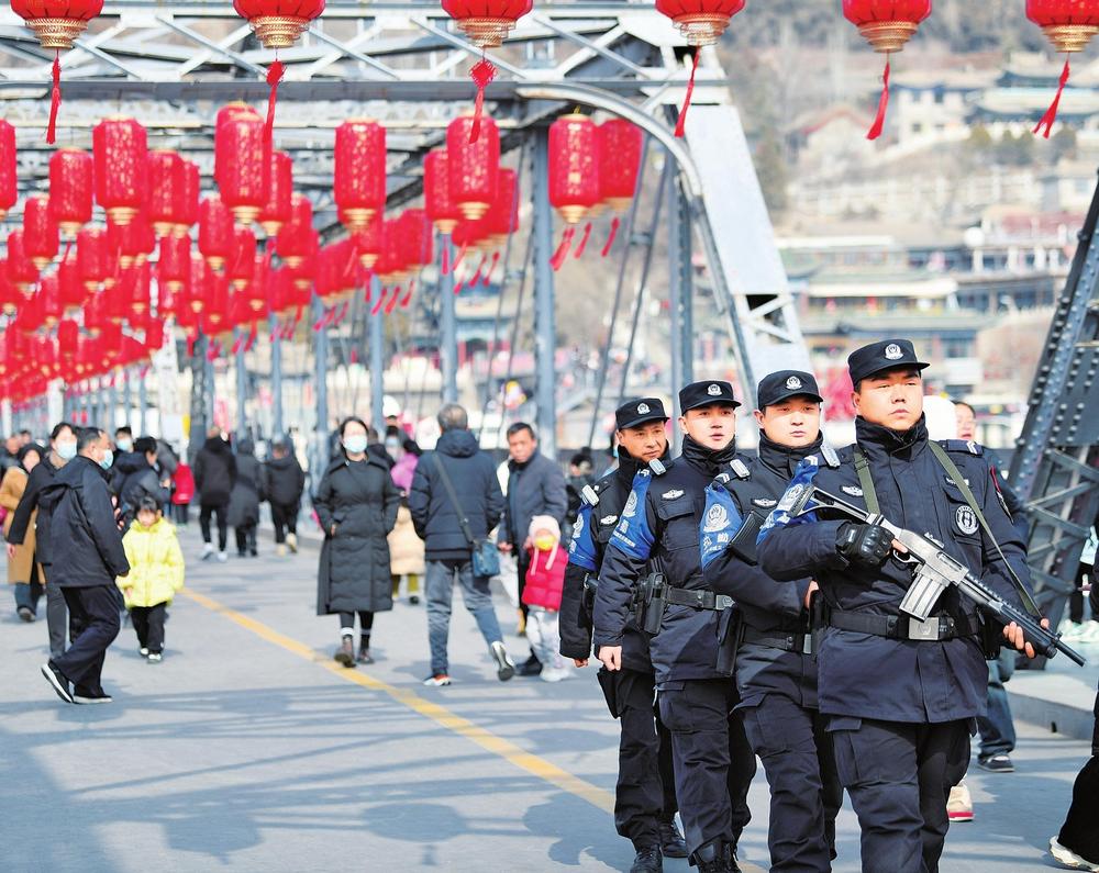春節(jié)期間,蘭州市公安局城關(guān)分局中山橋警務(wù)站民警在中山橋巡邏,確保社會治安大局平穩(wěn)有序。新甘肅·甘肅法治報(bào)記者王輝攝