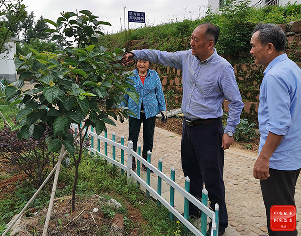 圖為江西省紀(jì)委監(jiān)委駐村工作隊員正在與村民交流果樹種植技術(shù)。