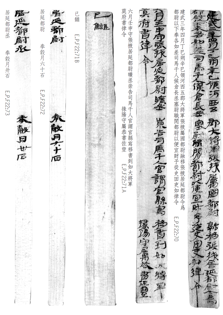 1974年8月出土于甲渠候官遺址第22號房址內。簡冊由10枚簡組成,每簡長22.8厘米,前兩簡寬2.5厘米,其余8簡寬1.4厘米。全文200字。內容為東漢建武三年(公元25年)竇融統(tǒng)治河西期間留下的一份完整的財政文書。簡文是關于居延都尉府吏員奉谷標準的通知,由領河西五郡大將軍張掖屬國都尉竇融幕府下發(fā),簡言“如律令”可知其指令具有法律效力。