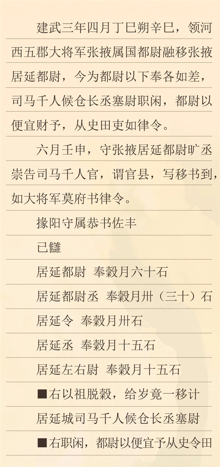 這封冊書記載了建武三年,竇融管轄河西時發(fā)布的一條關于都尉以下官吏奉谷等差的命令。根據(jù)竇融發(fā)布的新規(guī)定,我們可以看到,秩比二千石的居延都尉月奉谷僅為六十石,史書有“十斗一斛”及“十斗一石”的記載,此六十石即是六十斛,相比于史書記載中比二千石每月百斛的俸例要少,而其余官吏的俸祿也相應要少,雖然漢代不同時期的官吏俸祿存在變化,但對比所見的這種情況,可能也跟兩漢之交戰(zhàn)亂頻仍的社會環(huán)境有重要關系。(李晶整理)